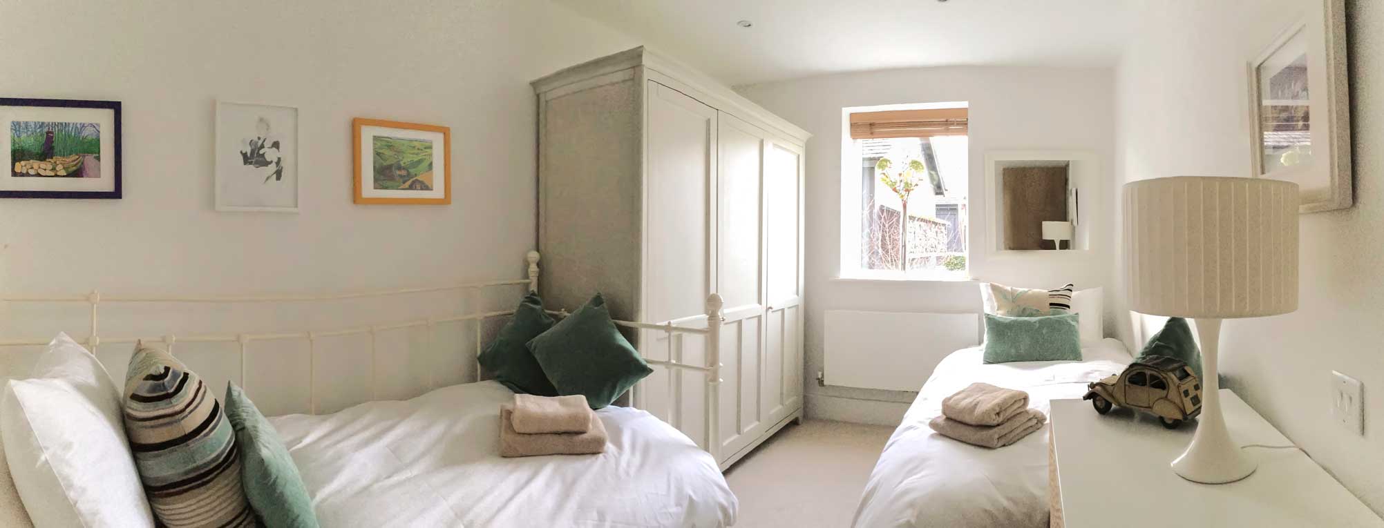 This impressively vaulted room has twin oak beds, matching side cabinets with bedside lamps and a dresser and twin velux roof light over beds.
